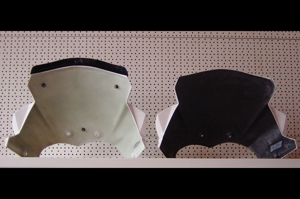 Das Windschild für die R1200GS ist um ca. 25 mm höher ( ohne Scheibe ) und im oberen Bereich ca. 70 mm breiter.