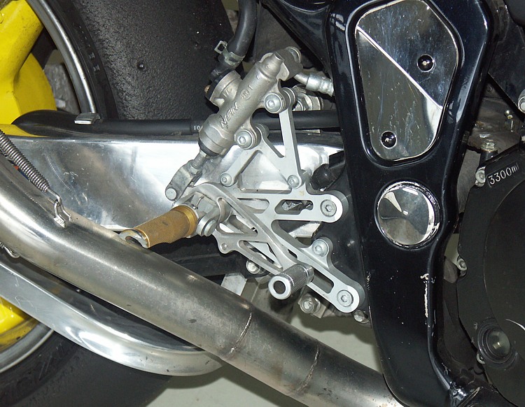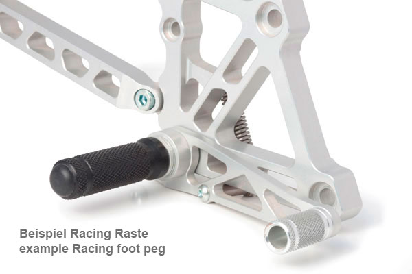 Die Fussrastenanlage enthält Rasten Racing in der Farbe der Grundplatte, wie abgebildet.