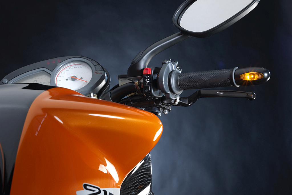 Der BL 1000 Dark befreit das Motorrad optisch von seinen Frontblinkern und vereint dabei richtungsweisende Funktion mit lenkerschwingungsdämpfender Wirkung.