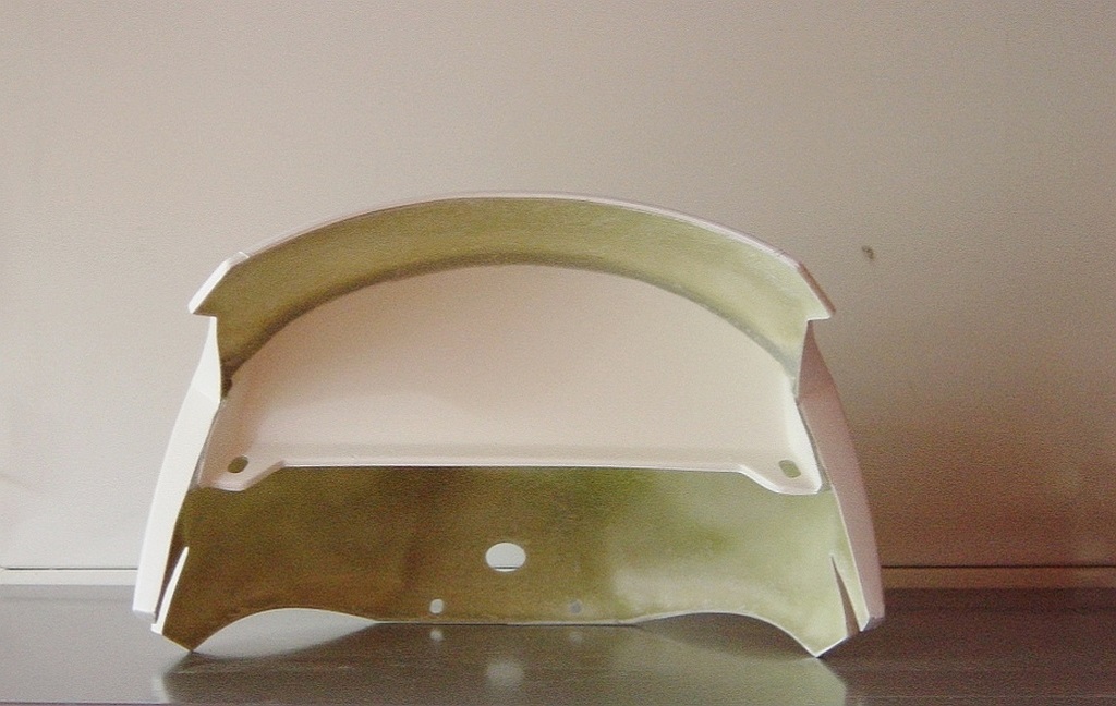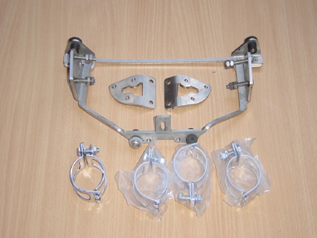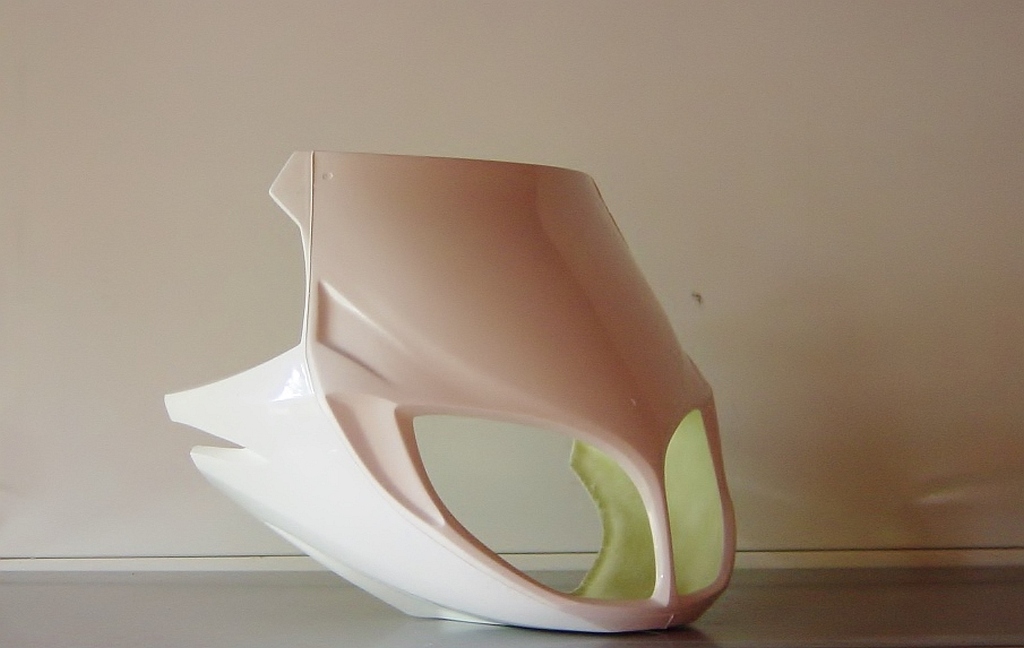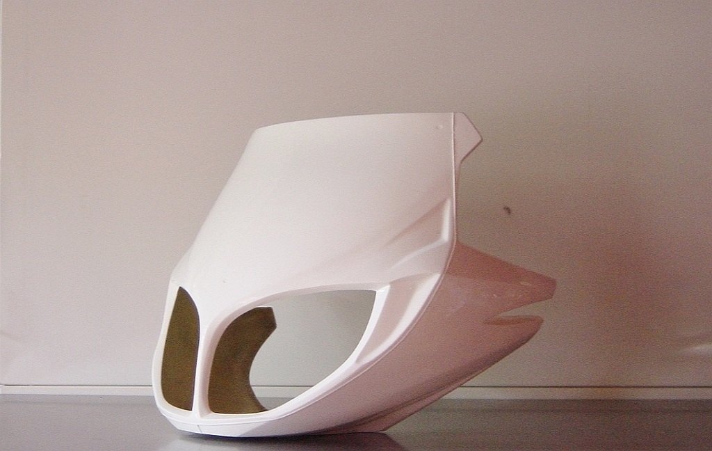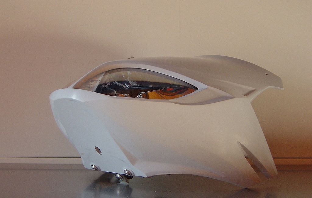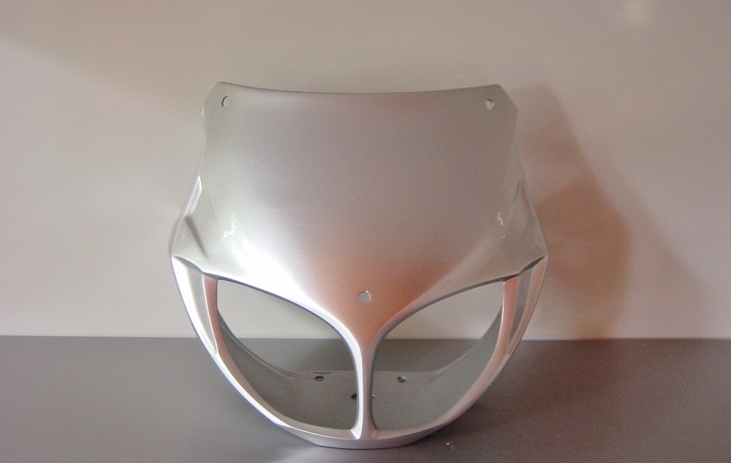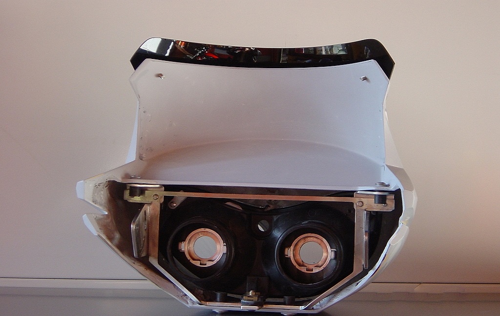 Maske GFK unlackiert weiss , VA Halterahmen , Schellen , Scheinwerfer komplett , Befestigung , Spoilerscheibe.